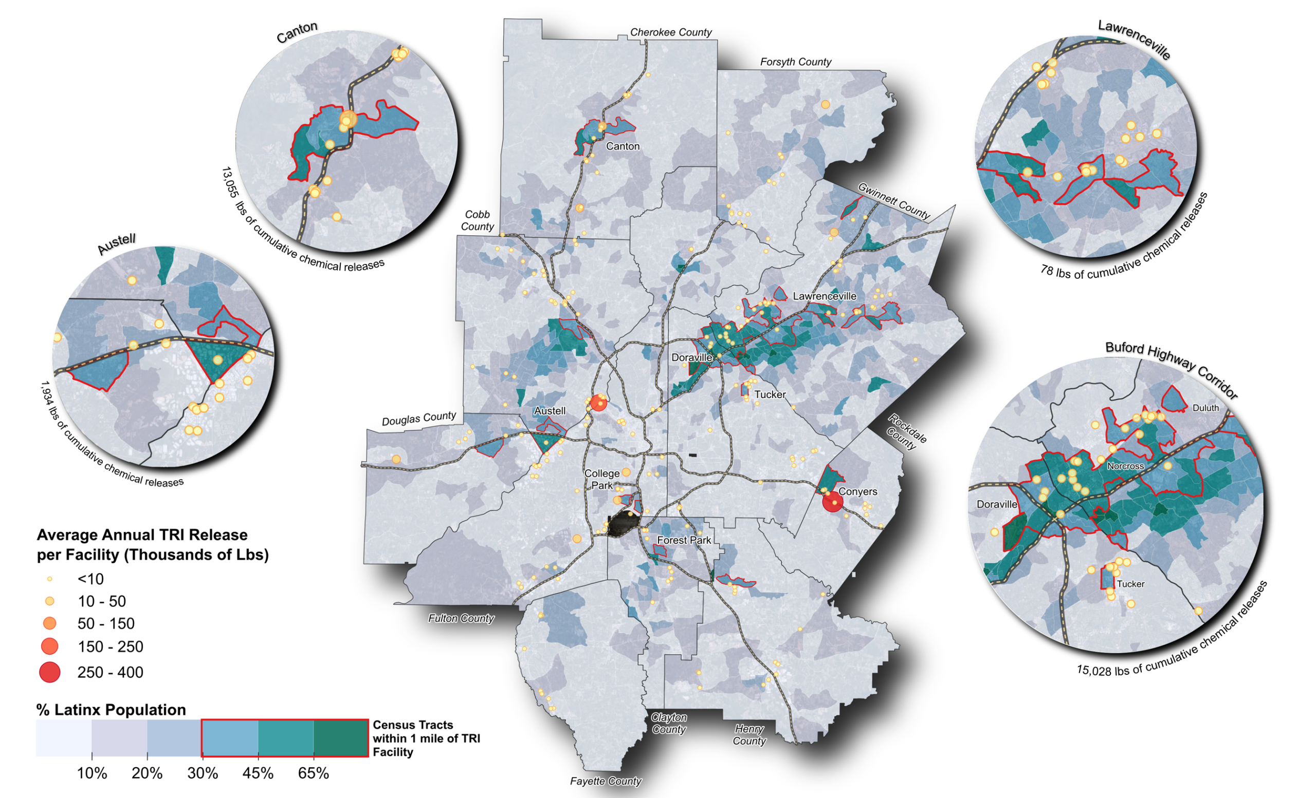 A prevalent environmental justice concern is the presence of industrial facilities that release toxic chemical byproducts harmful to both humans and the environment. A significant amount of these releases is measured through the U.S. Environmental Protection Agency’s (EPA) Toxics Release Inventory (TRI): a federal program that tracks the quantity of chemicals facilities release into the environment as well as their reduction strategies. This information is published annually in a publicly available dataset. Scholars have previously studied the distribution of TRI facilities in metro Atlanta and its interaction with various socioeconomic factors. The results revealed that census tracts with at least one TRI facility had higher populations of Black and Hispanic people. While this research has begun to establish a relationship between the location of toxic facilities and Latinx populations, a more in-depth analysis reveals additional concerning patterns.