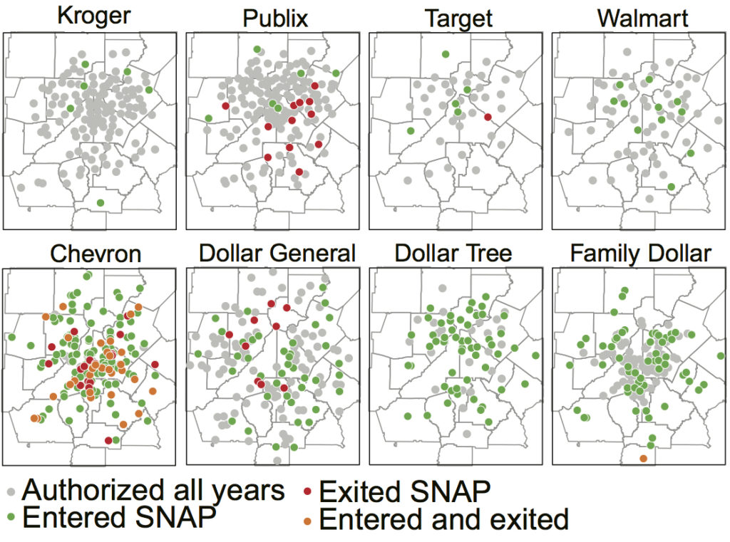 In these maps, grey dots show locations present during our entire study period, 2007 to 2013. Green dots became SNAP authorized retailers, red dots exited the program, and orange dots both entered and exited. Looking at the distribution of Publix and Target specifically, store locations were clearly clustered in the more affluent north side of the metropolitan area. Meanwhile, for Kroger and Walmart, this pattern is less stark. Most convenience stores followed a pattern similar to Chevron, concentrated to the south and east of downtown, with significant levels of turnover.
